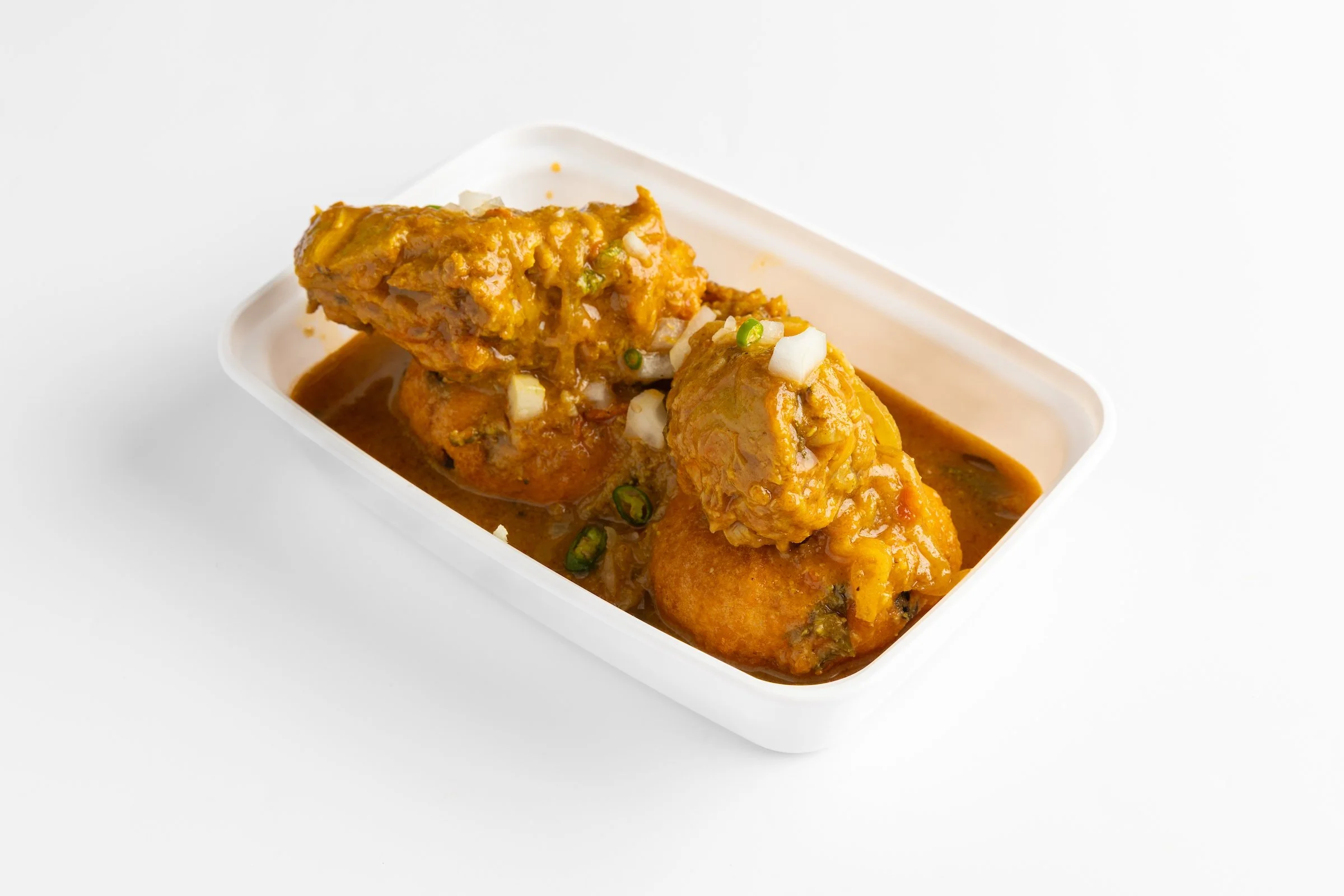 Golden Medu Vada (lentil fritters) served hot and fluffy, topped with our rich, home-style chicken curry simmered in aromatic spices. The perfect balance of savory vadas and comforting curry, bringing the authentic flavors of Chennai straight to your plate.