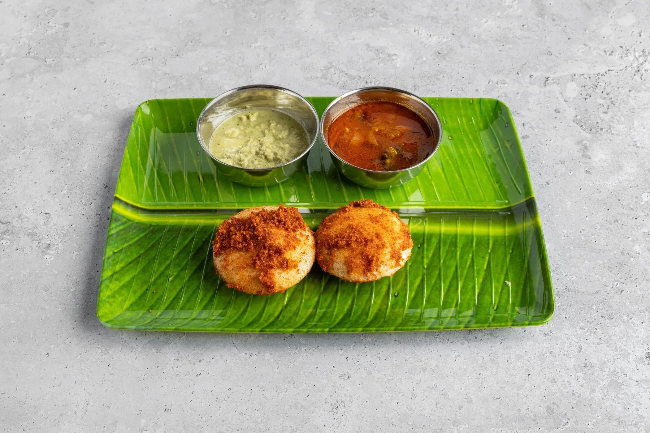 3 pieces idly, tossed in a special spicy mix and pure ghee. Served with our specialty chutney & sambar.