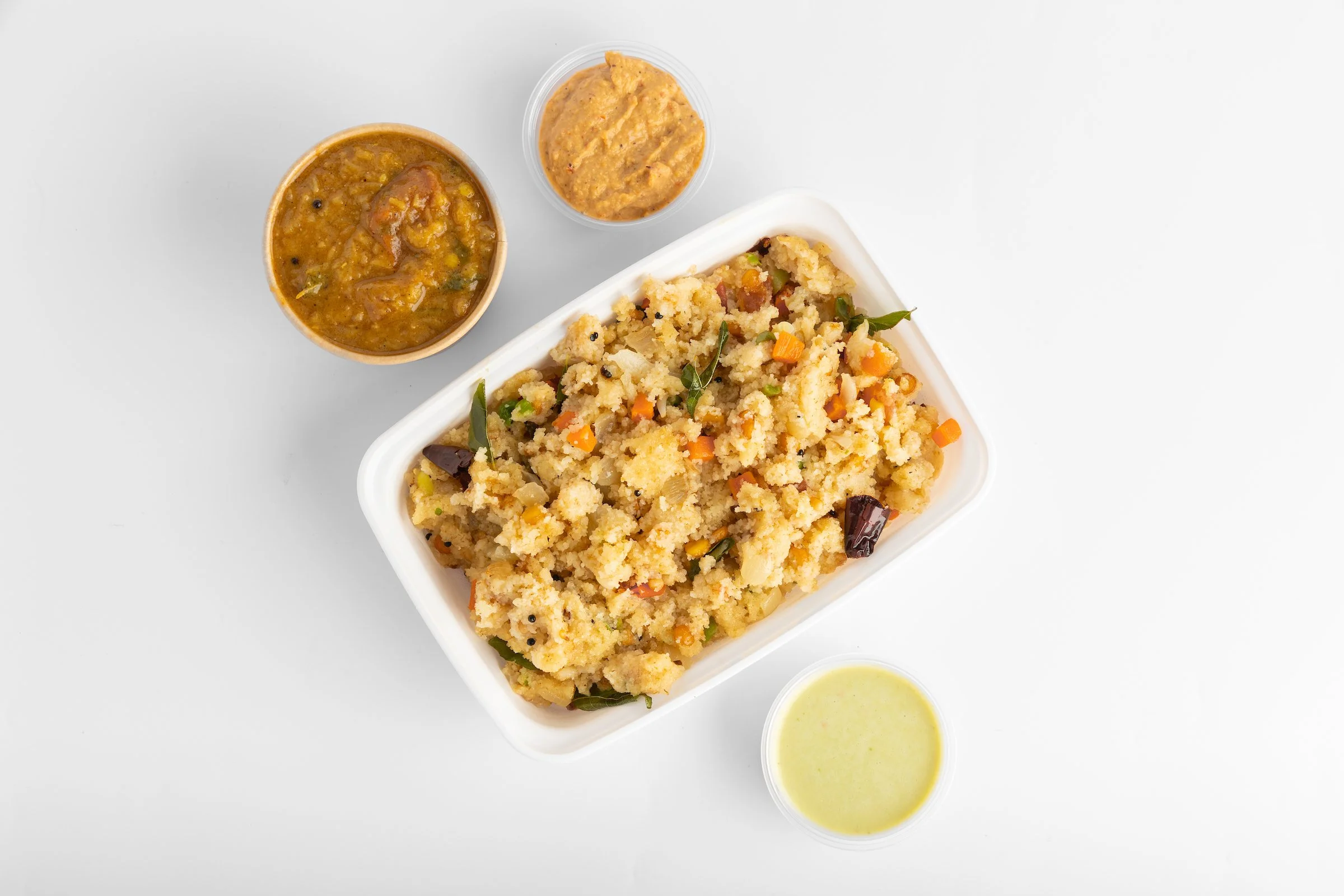 Chennai-Style Vegetable Upma is a delicious and nutritious dish commonly enjoyed as a breakfast or snack in South India. This flavorful preparation features roasted semolina (rava/sooji) cooked with a blend of tempered spices, fresh vegetables, and aromatic herbs. It is typically accompanied by freshly made chutney and sambar, enhancing its taste and appeal.