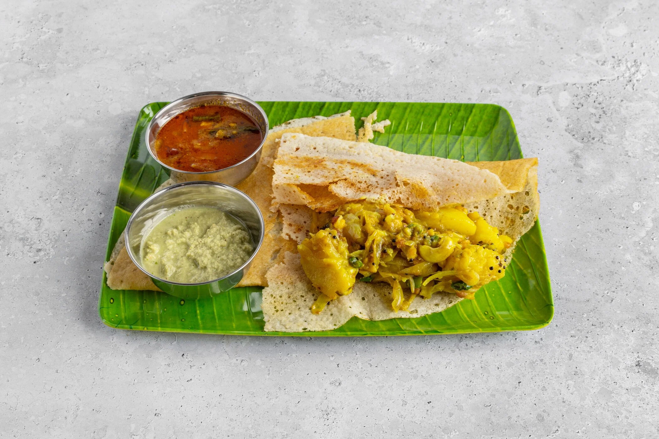 A special savory crepe, filled with flavorful potato and onion masala. This delicacy is served with sambar and chutney